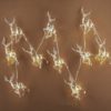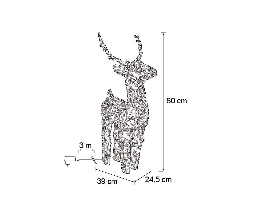 Sarvipäinen seisoma-asentoon aseteltu koristekauris. Mustan metallirungon ympärille on taivuteltu ruskeaa polyrottinkia, lämpimän valkoiset ledit kieputtu rungon ympäri. Soveltuu ulkokäyttöön. Voit sommitella kauniita valoryhmiä pihalle tai parvekkeelle!