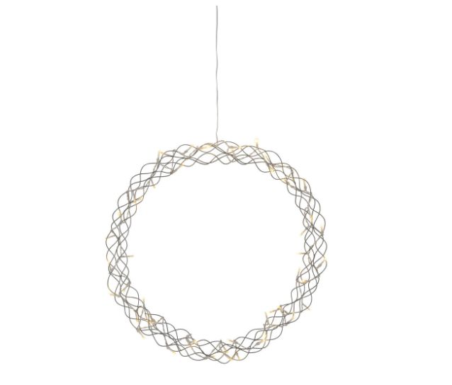 Upea ja suuri valokranssi, Ø 47 cm. Muotokieleltään klassinen metallikranssi, josta kaksi uutuussävyä: musta tai hopea. Led 50 kpl lämmin valkoinen, ei vaihdettava, paloikä n. 10 000 h. Muuntaja 3 V 0,9 W. Liitosjohto 5 m