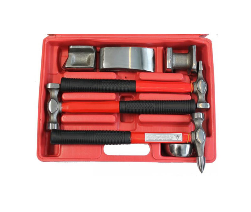 Monipuolinen peltisepän työkalusarja peltipintojen työstämiseen niin suoralle kuin kaarevalle pinnalle.