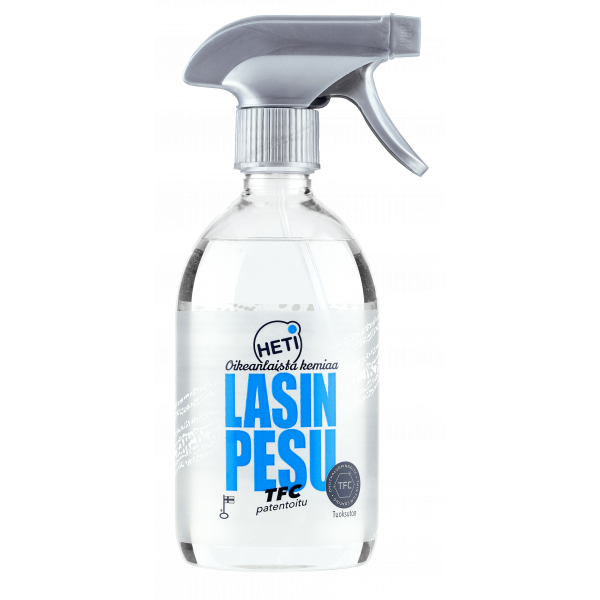 Hieman ekologisemmalla käyttövalmiilla Heti Ikkunapesulla saat ikkunat, peilit ja muut lasipinnat täydellisen puhtaiksi helposti ja nopeasti. Heti-lasinpesun teho perustuu kotimaiseen TFC™-teknologiaan eli ohutkalvopinnoittamiseen. Patentoitu ohutkalvopinnoite tekee lasipinnasta hydrofobisen ja likaa hylkivän. Ei lisättyjä väriaineita eikä hajusteita. Pullot kierrätysmuovista!