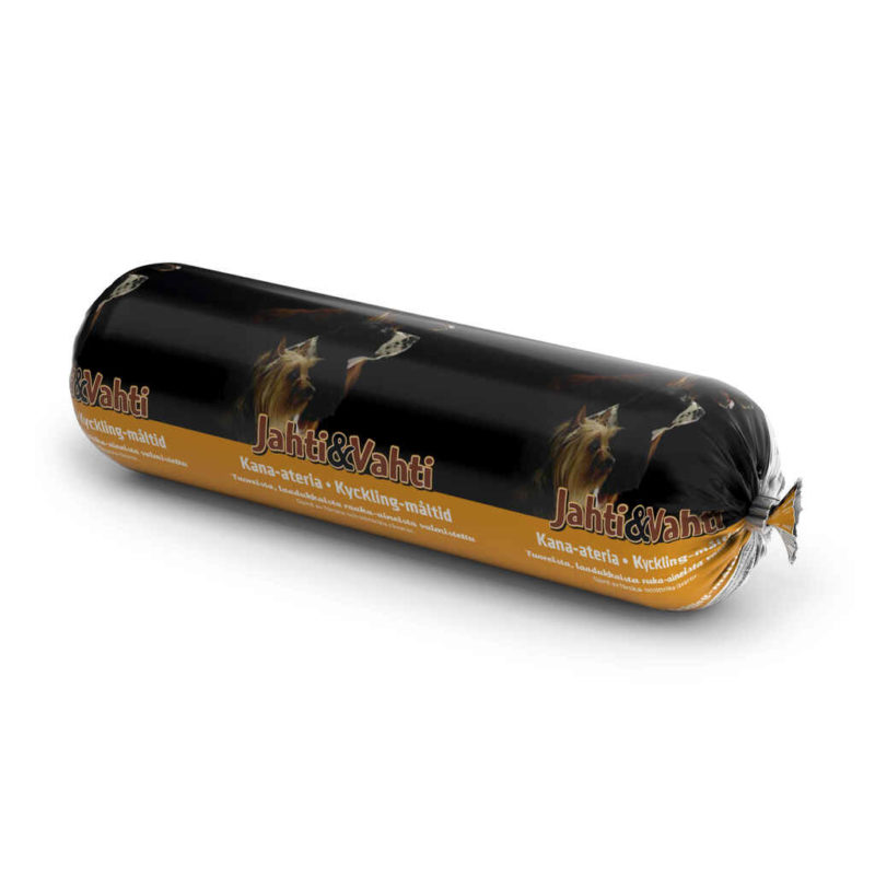 Jahti&Vahti Kana-ateria on kotona, matkoilla, luonnossa tai metsästysretkillä kätevä koiran eväs. Jahti&Vahti-ateriat ovat laadukasta lihaa helppokäyttöisessä kilon pakkauksessa ja mukavaa sekä maittavaa vaihtelua ruokalistaan koiralle kuivaruokien rinnalla. Kana-ateria sopii kuivaruokien lisukkeeksi kuin syötäväksi sellaisenaan. Kana-ateria on täysravintoa eli se sisältää kaikki koiran tarvitsemat ravintoaineet. Kana-ateria ei sisällä viljaa, mutta sisältää pienen määrän riisiä ja hernettä.