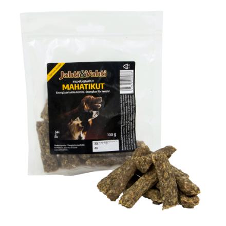 Kotimaiset, viljattomat kylmäkuivatut Jahti&Vahti Mahatikut ovat maistuva energiapatukka koirille. Sopii myös annettavaksi kissoille. Kylmäkuivaus säilyttää lihan maut ja aromit tuoreen veroisina ja näin ollen Jahti&Vahti Mahatikku on erityisen maittava myös nirsoimmille koirille. Sisältää runsaasti energiaa ja proteiinia.