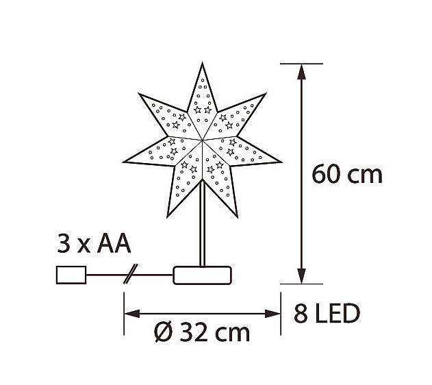 Sisäkäyttöön soveltuva pöytäkoriste, kokonaiskorkeus 60 cm. Valkoinen 7-haarainen paperitähti (Ø 32 cm) seisoo tukevasti metallirungon ja jalustan varassa. Näyttävä koriste asetettavaksi tason päälle tai ikkunalaudalle. Paperitähden sisällä on kahdeksan lämpimän valkoista lediä. Valo kajastaa kauniisti tähdestä kuvioiden läpi. Toimii 3 x AA paristoilla, ei sisälly pakkaukseen. Paristokotelo jalustan pohjassa. Sisältää ajastimen. Valo palaa 6 h ja sammuu 18 h ajaksi.