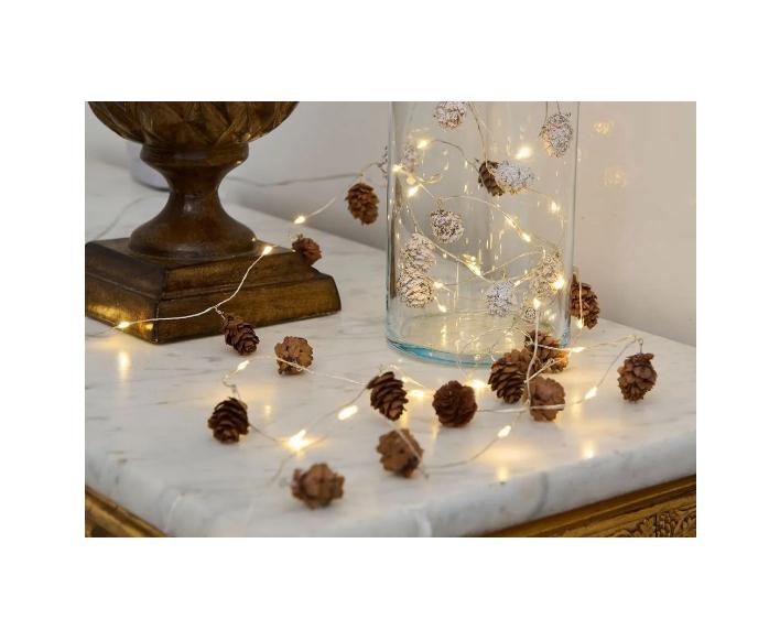 hopea metallilankajohto, käpy -koristeiden väli 10 cm, kirkas liitosjohto 30 cm, 2xAA -paristot, ei sis., 6/18H ajastin