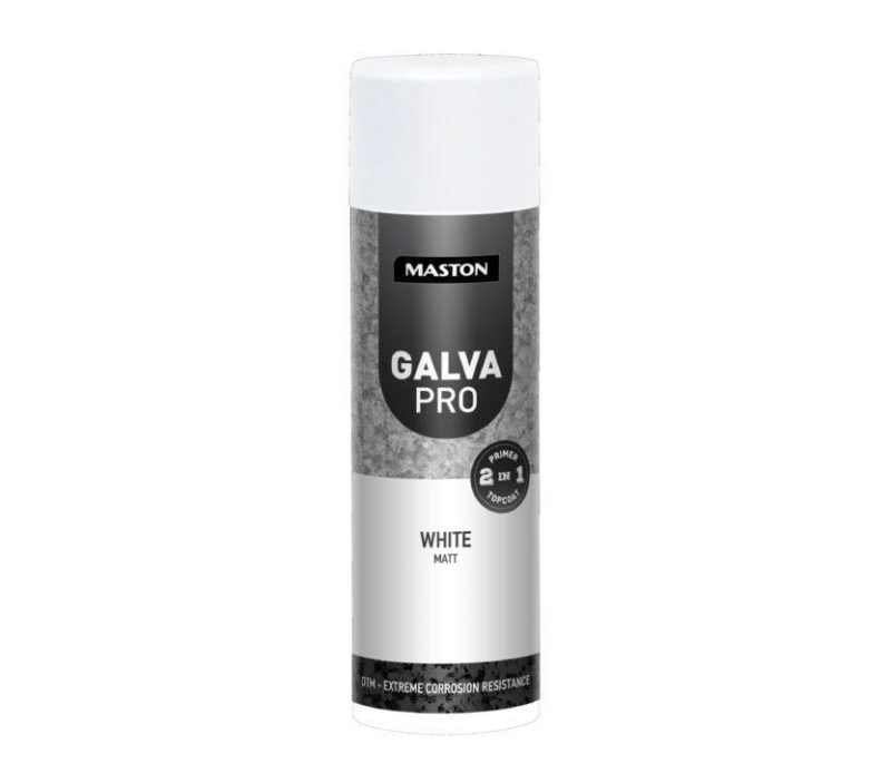 Maston Galva Pro spraymaali on 2in1 tuote, joka soveltuu käytettäväksi sellaisenaan tai niin pohja- kuin pintamaalinakin. Maali soveltuu lähes kaikille metalleille (esim. rauta, alumiini, rosteri, haponkestävä- ja galvanoituteräs) sekä esim. puupinnoille. Maalin ruosteenesto-ominaisuudet ovat huippuluokkaa ja on testattu ASTM B117-2019 standardin mukaisesti, kesto 400h.