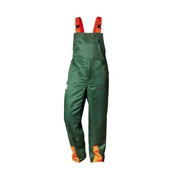 Päällinen 65% polyesteri 35% puuvilla, 9-kerroksinen viiltosuojaus 100% polyesteriä, vuori 100% puuvillaa, rintatasku vetoketjulla, 2 sivutaskua, 1 lannetasku