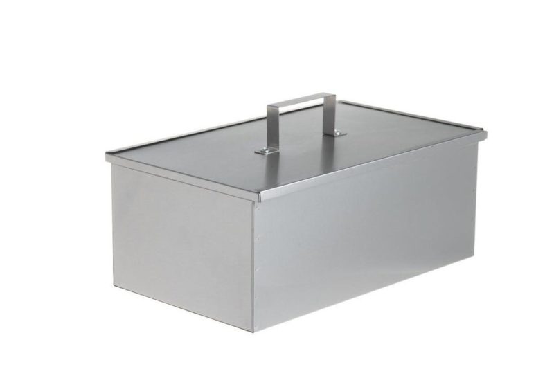 Savustuslaatikko rasvapellillä. Rasvapelti helpottaa savustuslaatikon puhdistusta ja pidentää sen käyttöikää. Kaksi savustusritilää. Savustuslaatikko ja rasvapelti ruostumatonta terästä. Savustusritilät kromattua terästä.