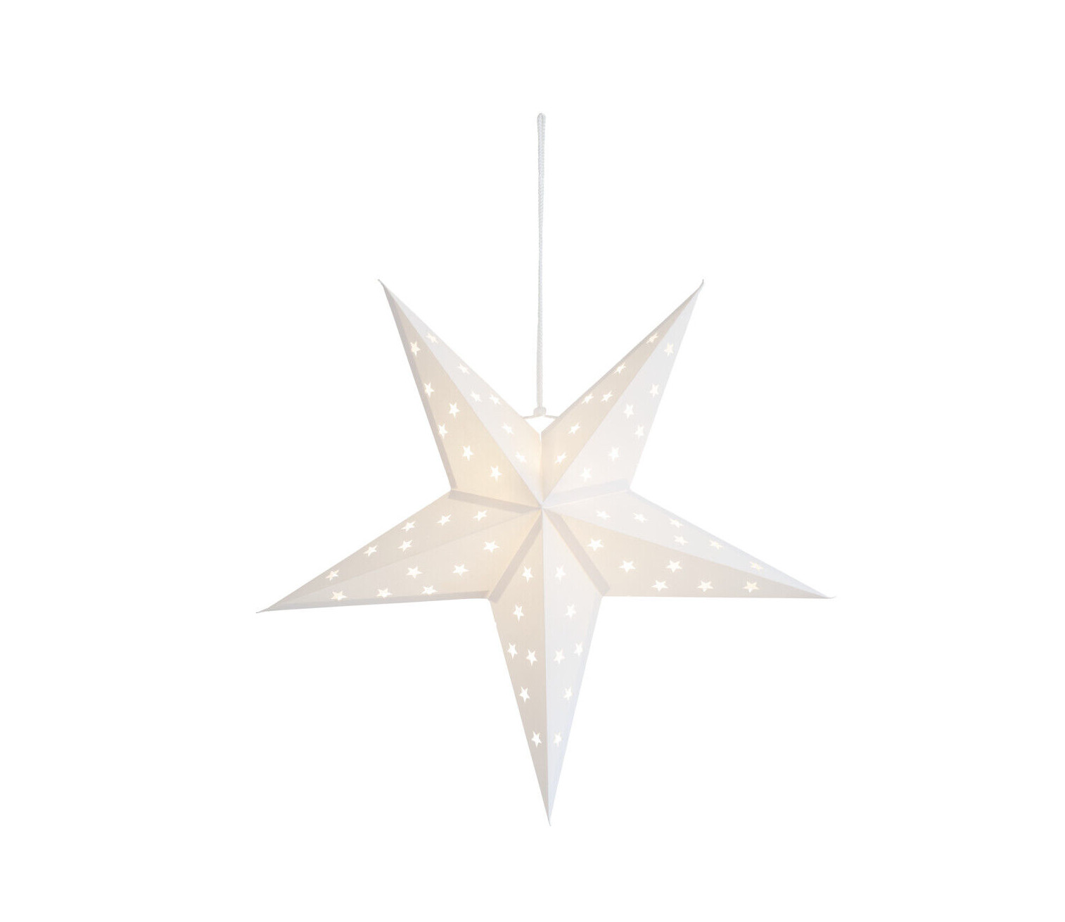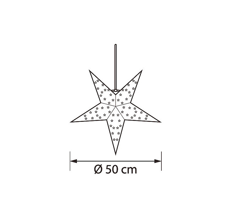 Klassinen valkoinen paperitähti viidellä sakaralla. Halkaisija 50 cm. Tähti suljetaan nauhalla. Valo kajastaa tähden muotoisten reikien läpi. Ripusta vaikkapa useampi tähti näyttäväksi asetelmaksi! Paperitähti ei sisällä valonlähdettä