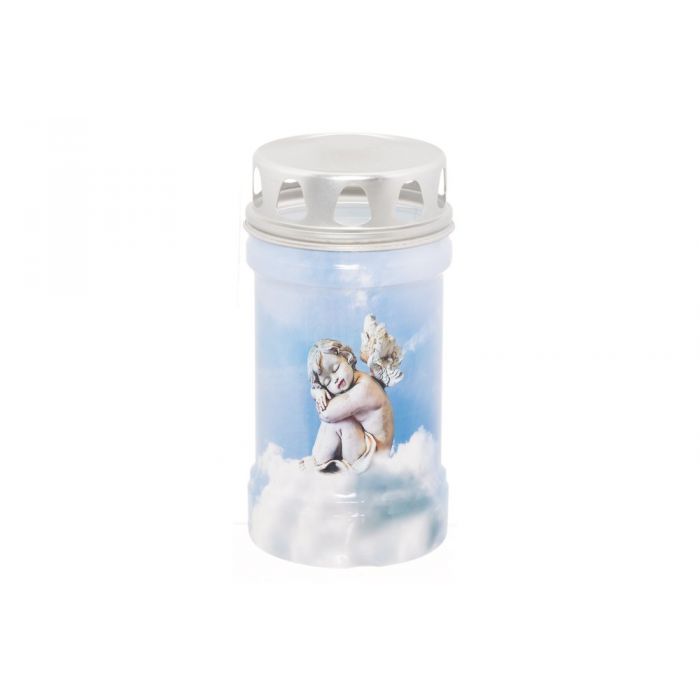 Hautakynttilä enkelin kuvalla. Hopeanvärinen metallinen tuulisuoja. Paloaika noin 36 tuntia.