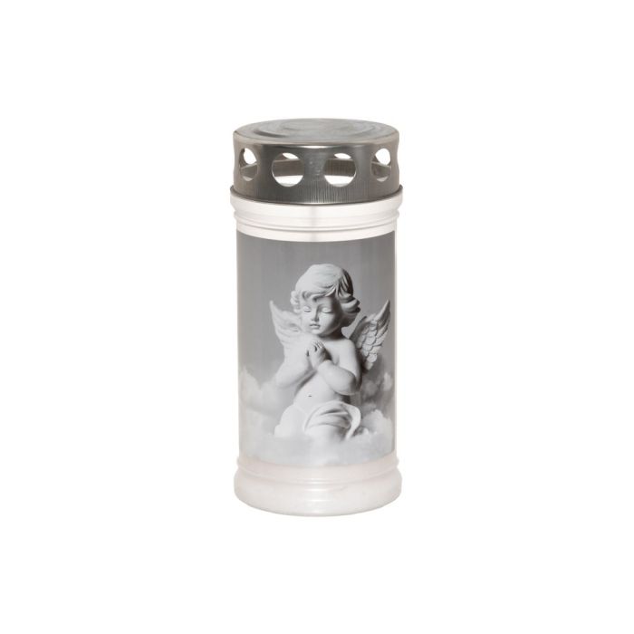 Hautakynttilä enkelinkuvalla. Paloaika noin 65h, olosuhteista riippuen.