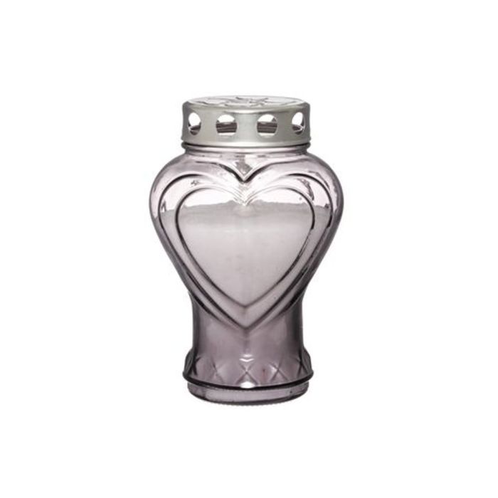 Lasinen sydämen mallinen hautalyhty, metallisella tuulisuojalla. Paloaika noin 60 tuntia.