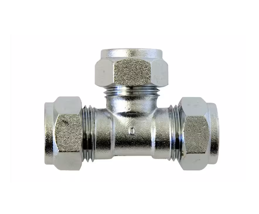 Puserrus t-liitin, materiaali: kromattu erikoismessinki, koko: 15 mm. Tyyppihyväksytty.