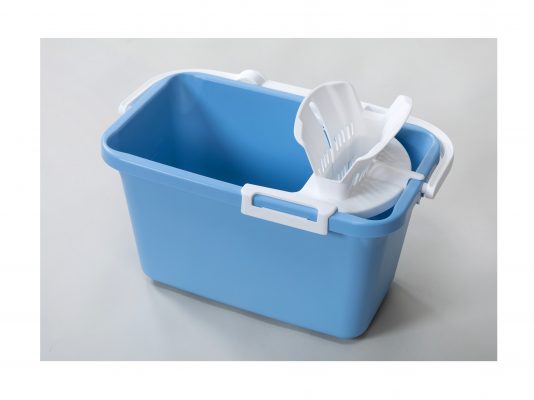 Kiinnitä puristin SINI – sankoon tai pyöreään ämpäriin ja purista taittomoppi riittävän kuivaksi.