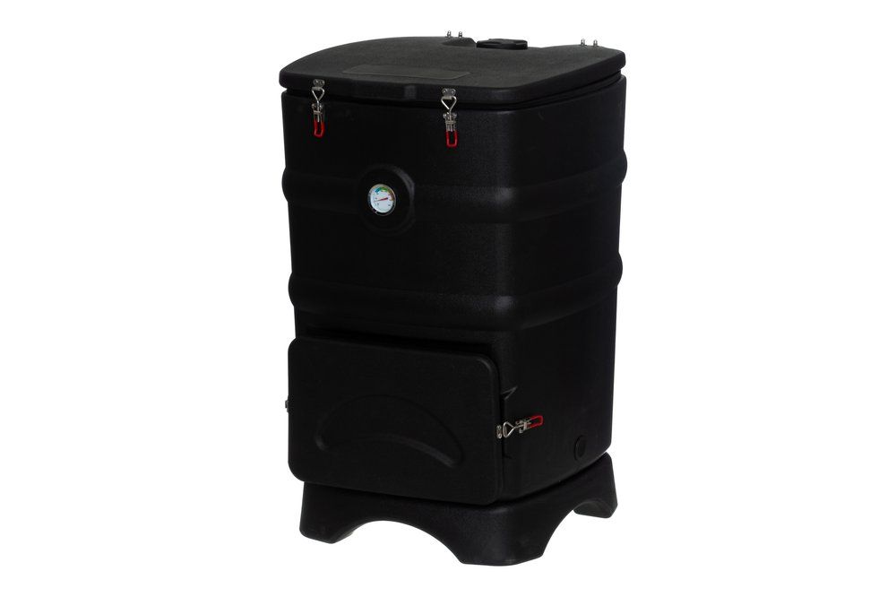 Lämpömittari helposti nähtävillä kompostin etuosassa. Kannen aukipito salpa lukkiutuu automaattisesti, joten kompostin täyttäminen on helpompaa. Säädettävä ilmanvaihtoventtiili. Suotonestesäiliö ja hanalla varustettu nesteidenpoistoletku. Suurikokoinen ja tiivis multaluukku helpottaa tyhjentämistä. Tilavuus 110 l, joten soveltuu mainiosti myös pienempien perheiden kotitalouksiin ja mökkikäyttöön. Tätä Kompostoria voi käyttää myös talven pakkasilla. Kompostoituminen pysyy käynnissä kun sitä täytetään normaalisti, tyhjennetään tiheämmin ja käytetään runsaasti kuiviketta. Jäätyminen ei kuitenkaan vahingoita kompostoria tai kompostimassaa, vaan kompostoituminen jatkuu taas kelien lämmettyä