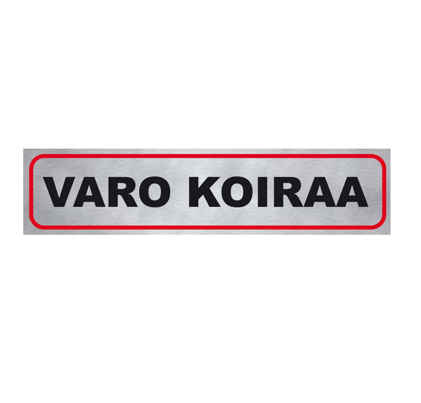 Veden- ja säänkestävä itseliimautuva infotekstitarra. Ulkonäkö metallia muistuttava, hopeanvärisellä taustalla mustat kirjaimet punaisessa kehyksessä, heijastava. Koko 17 x 4 cm.