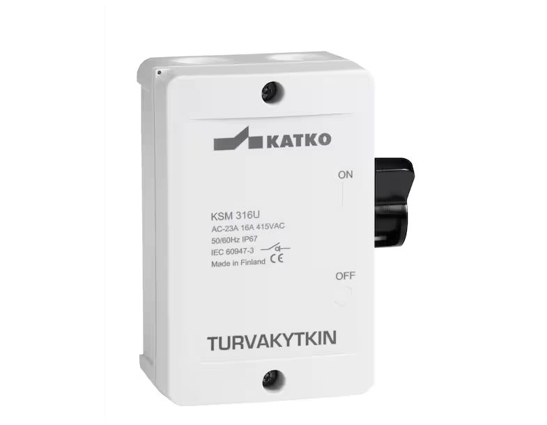 Katkon 3-napainen turvakytkin, jolla on hyvä suoja useita kemikaaleja vastaan ja jonka materiaali on itsesammuva. Kytkimessä on muovikotelo, sekä lukittava väännin. Vakiona kalvotiiviseet 2 x 20 mm (ylös ja alas) ja 2 x 15 mm (pohjassa) sekä vedonpoistajat (2 kpl). Kytkimen kansi on sinetöitävissä ja väännin on sinetöitävissä ON-asentoon.