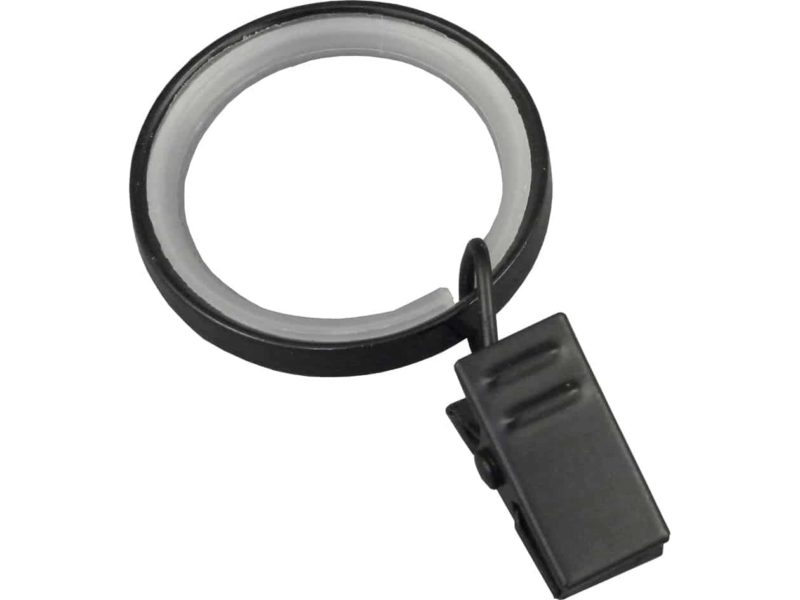 Metallinen verhorengas nipistimellä, renkaan sisähalkaisija 25 mm. Renkaan sisäosa silikonia, liukuu pehmeästi ja naarmuttamatta tangon pintaa.