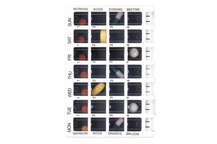 Lääkkeet voidaan säilyttää dosetissa jaettuna seitsemälle viikonpäivälle. Lisäksi voidaan erotella aamuisin, päivisin, iltaisin tai öisin otettavat lääkkeet. Näin tabletit on helppo säilyttää erillään. Mitat 15,6x 11,5 x 2,6 cm.