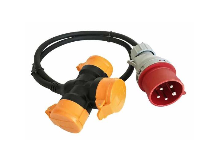 Adapteri, joka muuntaa 3-vaiheisen 16 A:n voimavirran 1-vaiheiseksi 16 A schuko-syötöksi